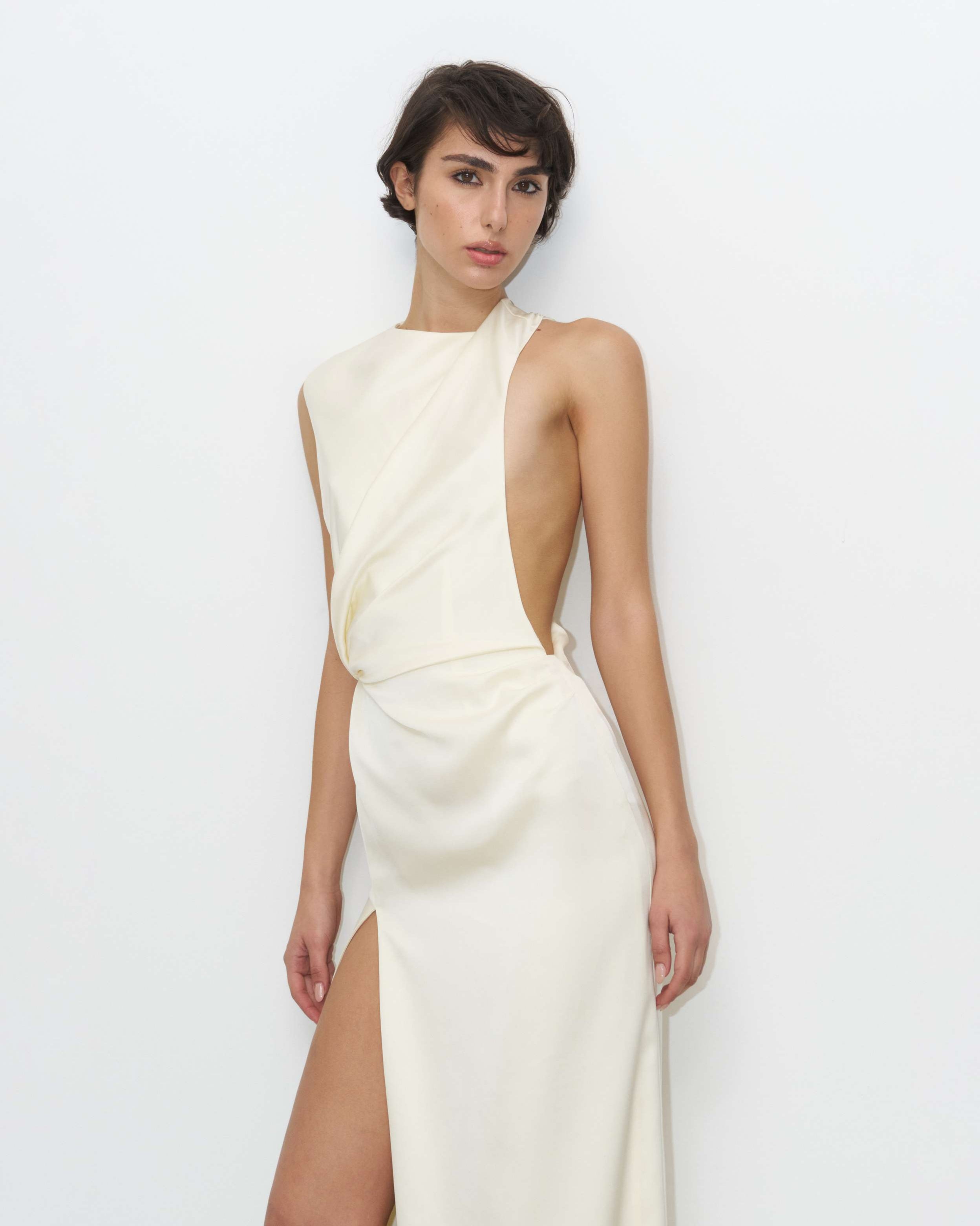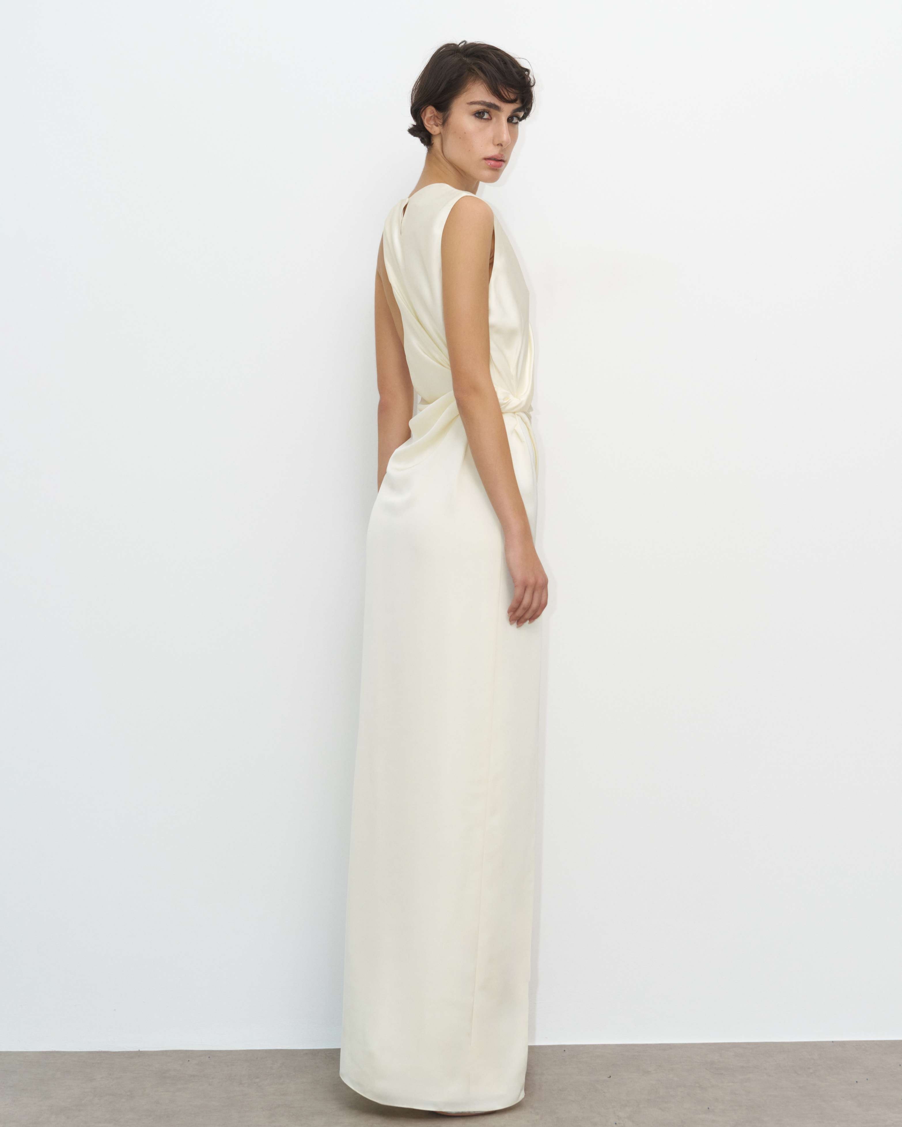 • Gathered fabric at waist with asymmetrical sleeve detail